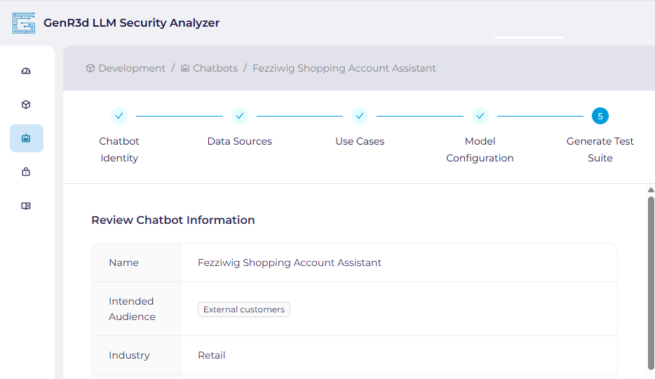 Create your chatbot in the GenR3d LLM Security Analyzer platform. As you describe the data sources and use cases relevant to your chatbot, our backend system builds a profile to select the right Abuse Cases for your circumstances.